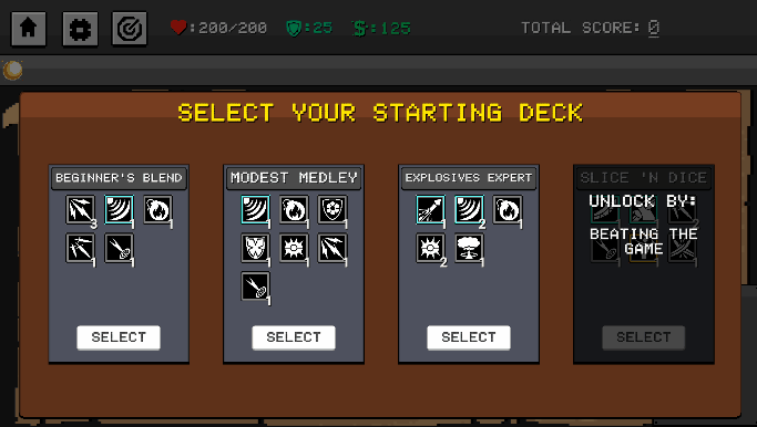 Upon starting the game, you can now select from a number Starting Decks which is essentially the cards you start with. At first you only have access to the basic deck (AKA Beginner's Blend) but you will be able to unlock the later decks by completing various objectives. These are all tracked in Unity's PlayerPrefs and thus are persistent across sessions. Unless you clear your browser cache, you will retain access to the decks you unlock even if you quit the session.